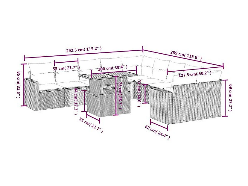 Salon de jardin 11 pcs avec coussins gris résine tressée