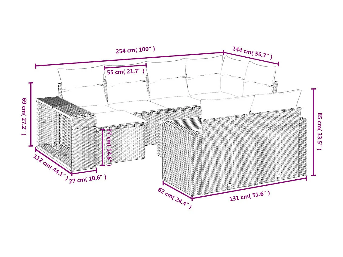 Salon de jardin 11 pcs avec coussins noir résine tressée