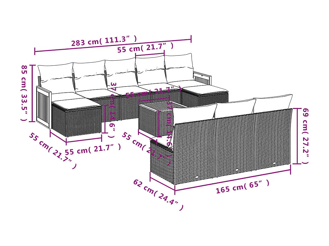 Salon de jardin 11 pcs avec coussins noir résine tressée