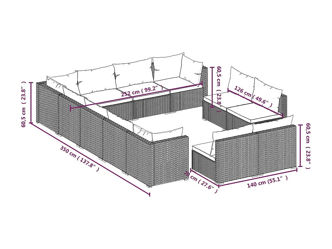 Salon de jardin 12 pcs avec coussins Marron Résine tressée
