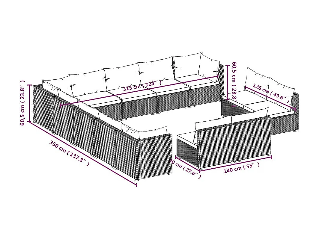 Salon de jardin 13 pcs avec coussins Marron Résine tressée