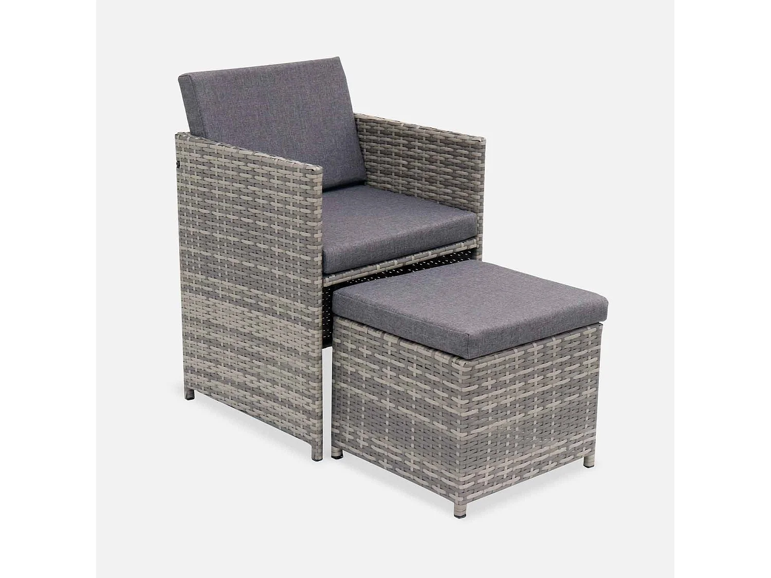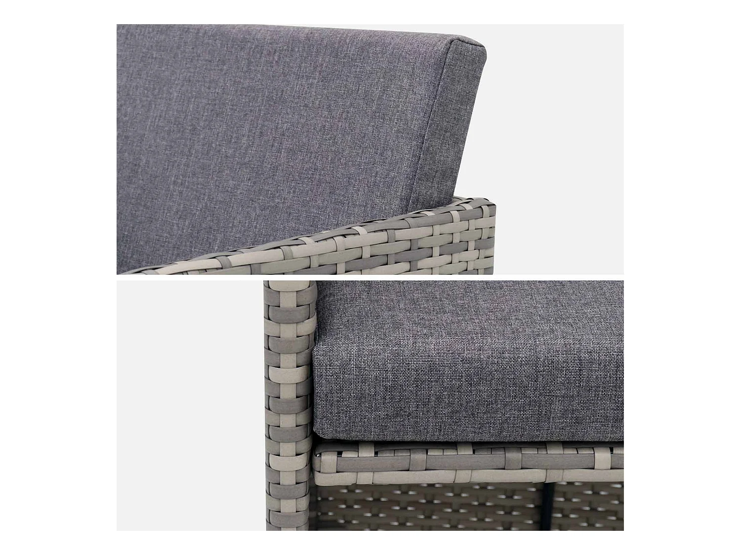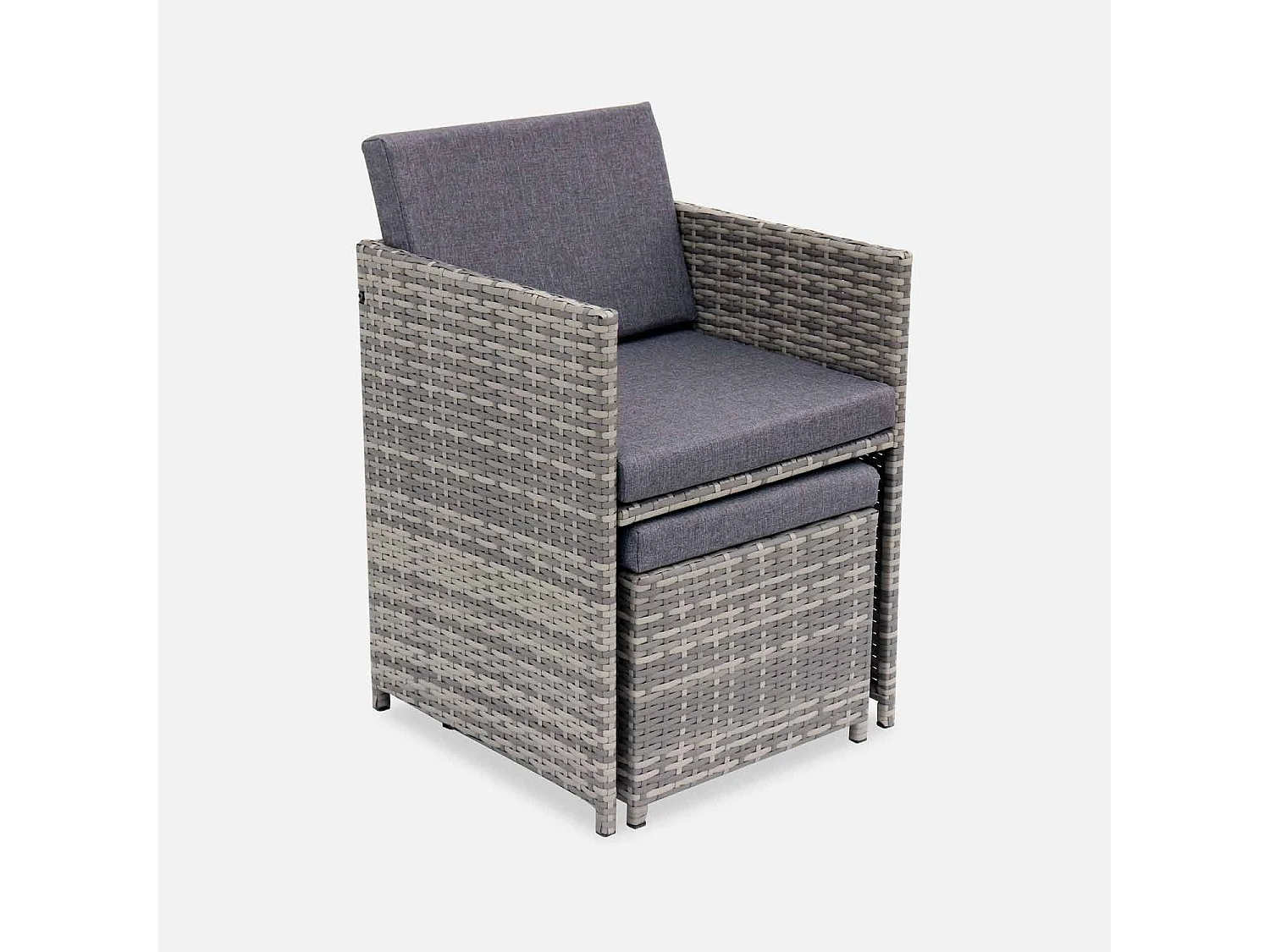Table de jardin encastrable résine tressée + 8 assises – Vabo – Coloris nuances de gris. Coussins gris chiné. table encastrable