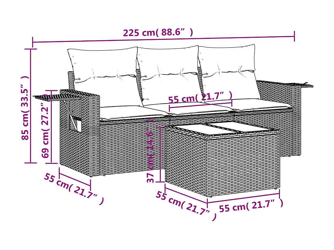 Salon de jardin 4 pcs avec coussins gris résine tressée