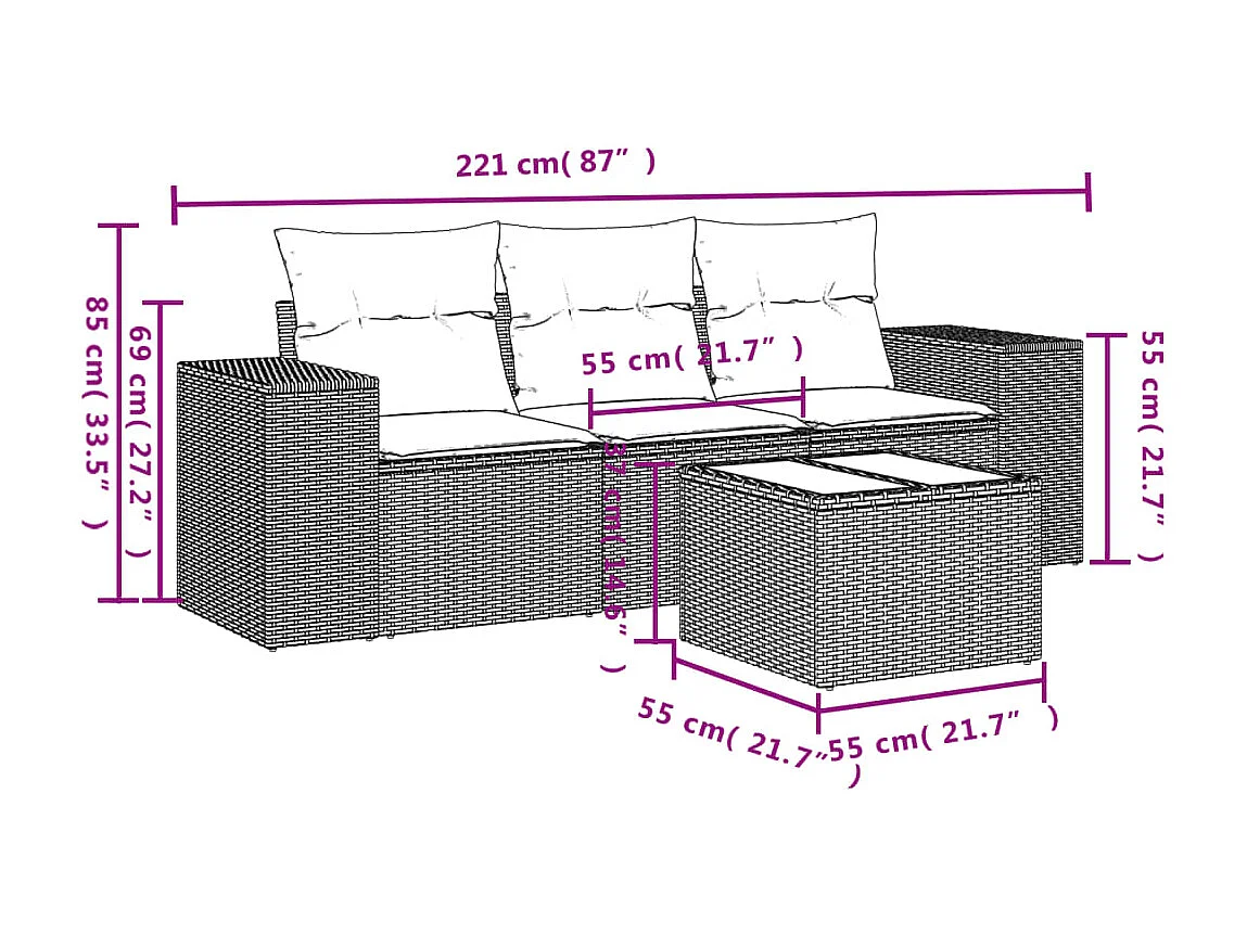 Salon de jardin 4 pcs avec coussins noir résine tressée