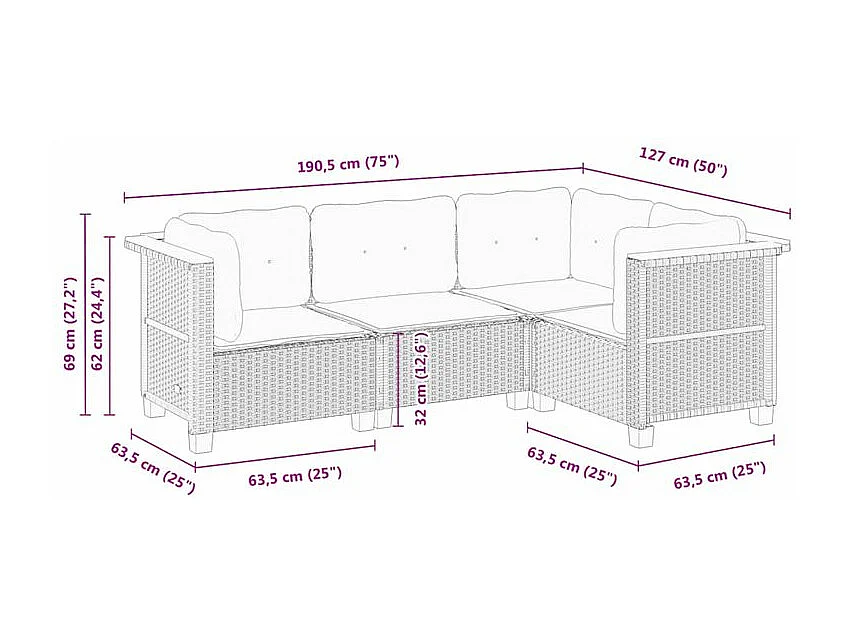 Salon de jardin 4 pcs avec coussins noir résine tressée
