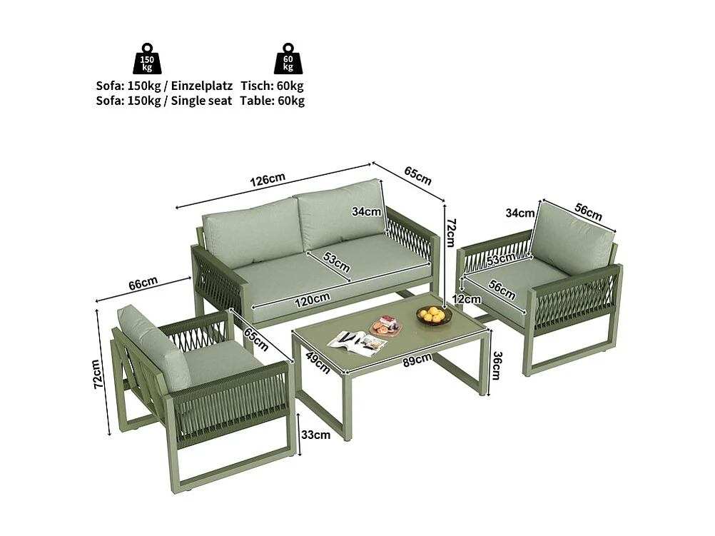 Salon de jardin 4 places en métal: 1 canapé 2 places, 2 fauteuils et table basse en verre trempé - Vert
