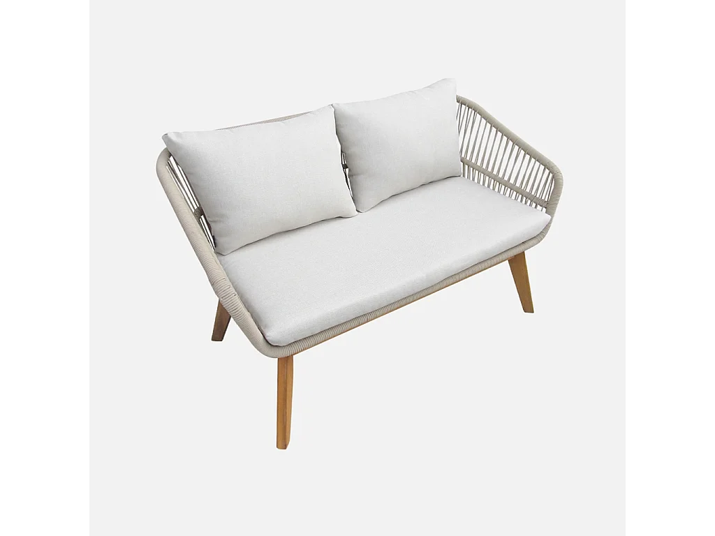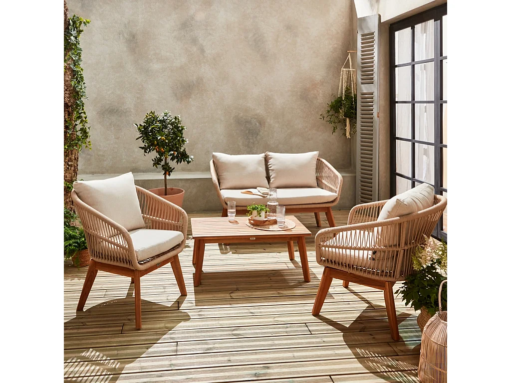 Salon de jardin 4 places – ROSARIO – en corde tressée. bois et aluminium. beige / coussins beiges