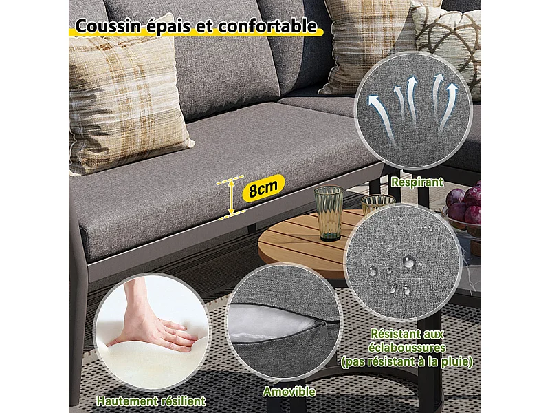 Salon de jardin 5-6 places en métal: 1 fauteuil, canapé d'angle modulable et tables gigognes - Gris