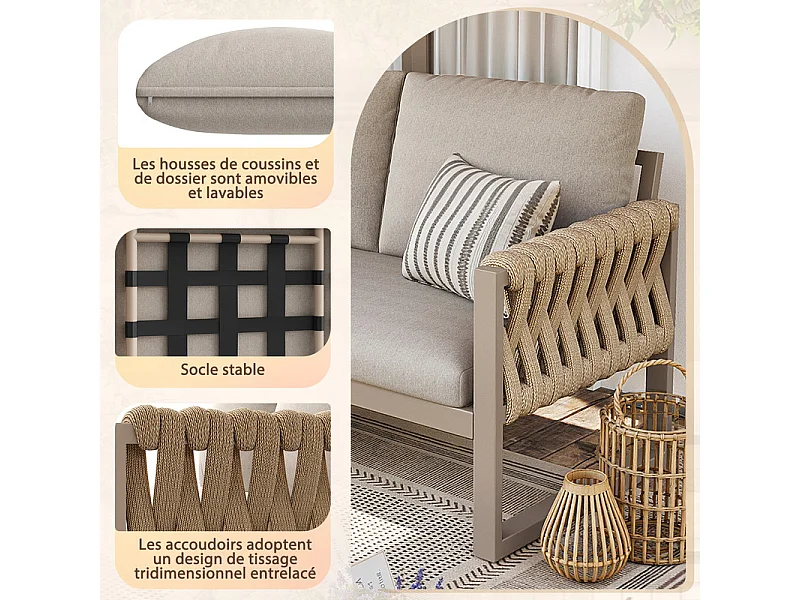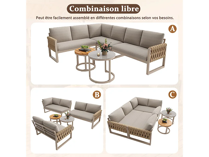 Salon de jardin 5-6 places en métal: canapé d'angle modulable et tables gigognes - Beige