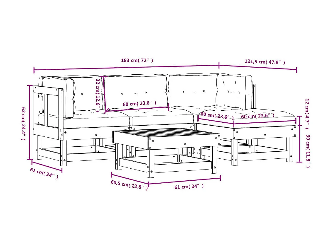 Salon de jardin 5 pcs avec coussins blanc bois massif