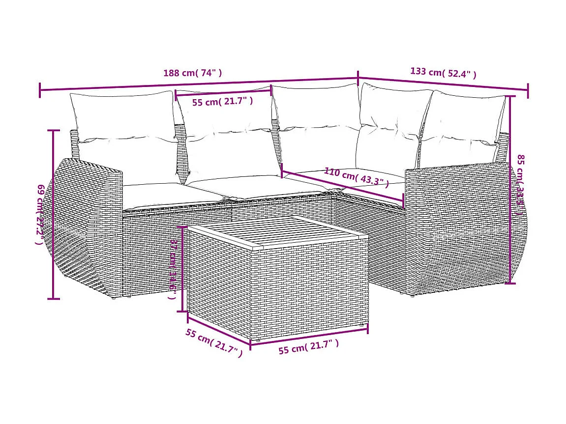 Salon de jardin 5 pcs avec coussins gris résine tressée