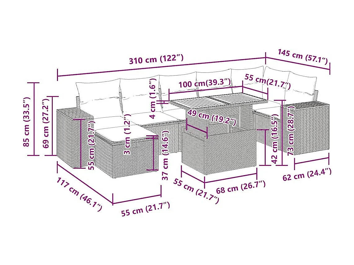 Salon de jardin 5 pcs avec coussins noir résine tressée acacia
