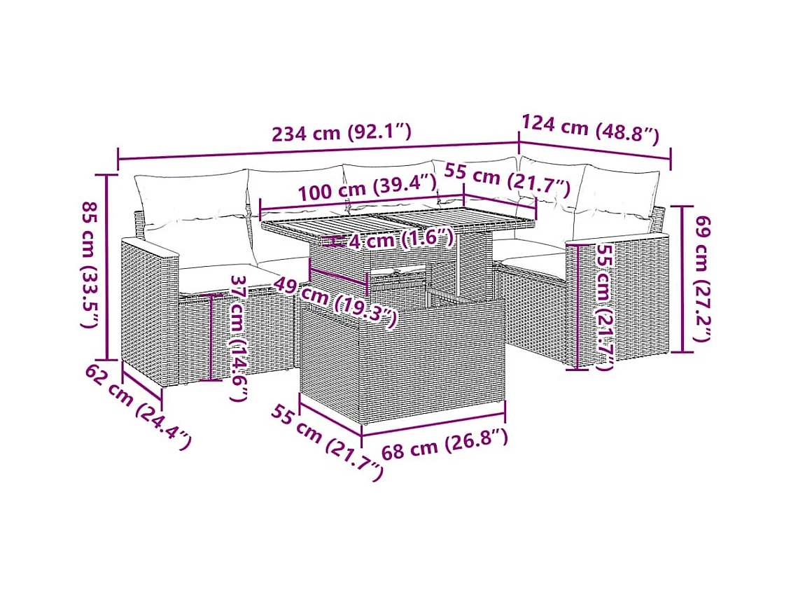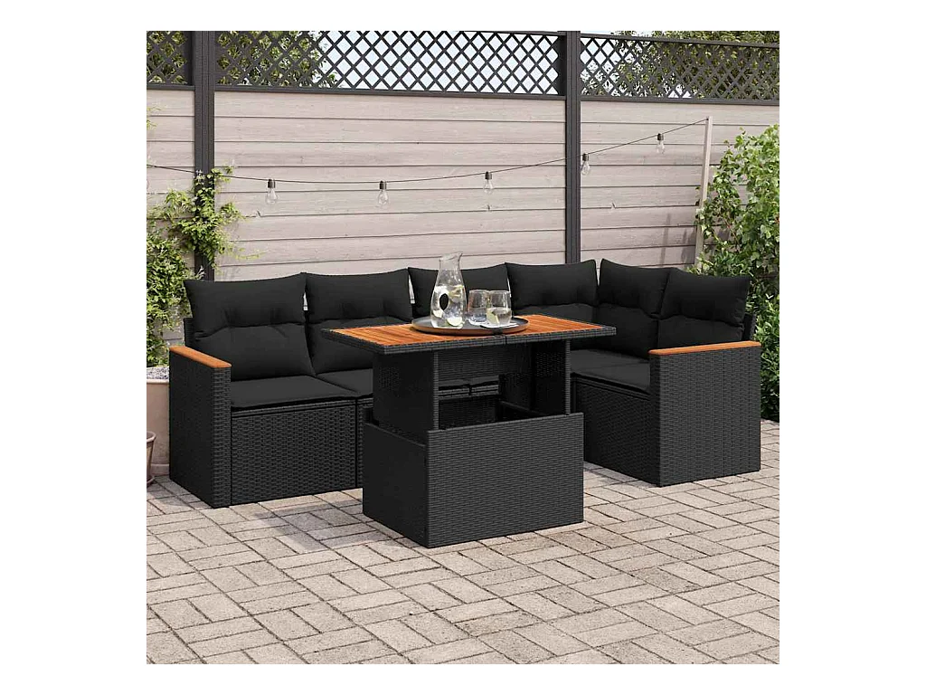 Salon de jardin 6 pcs avec coussins noir résine tressée acacia