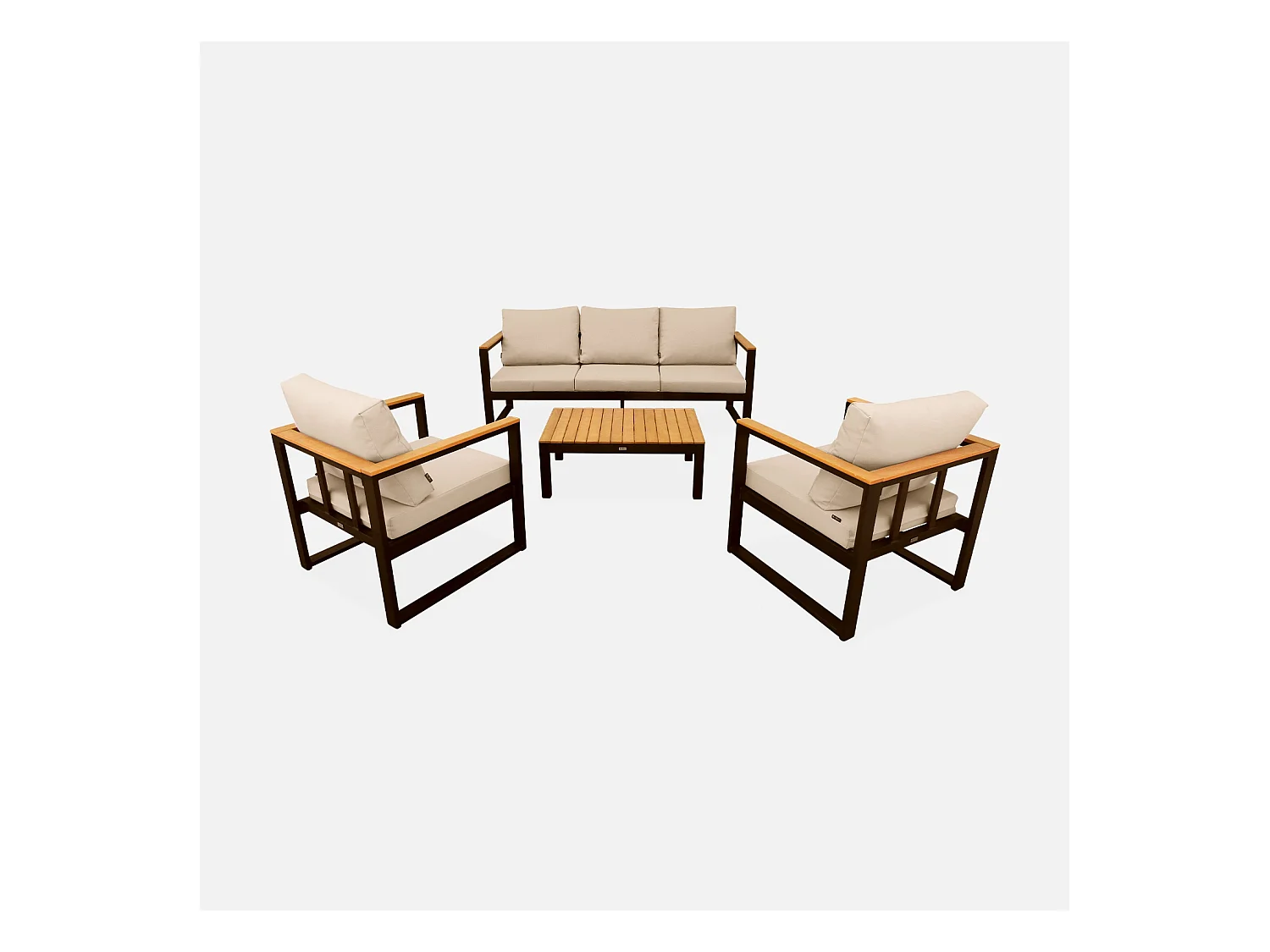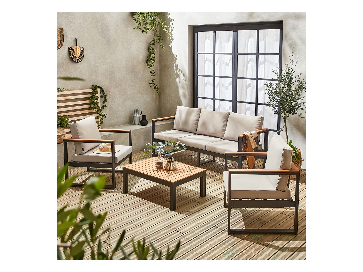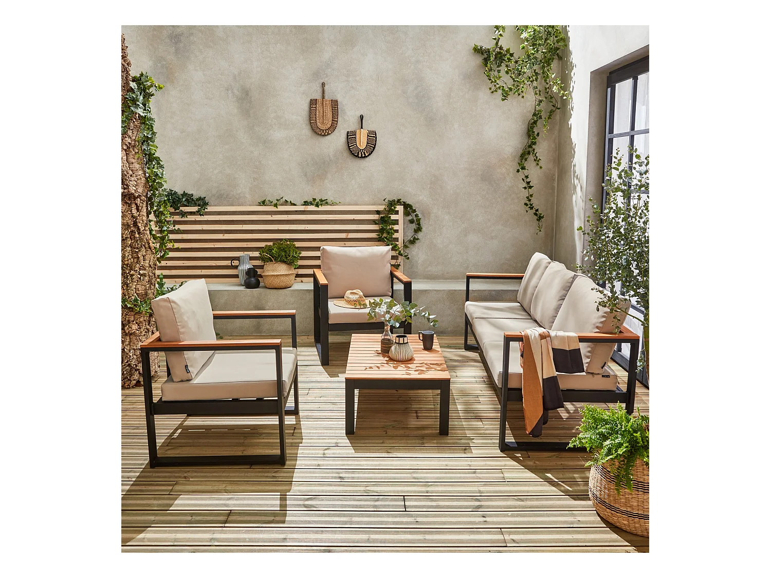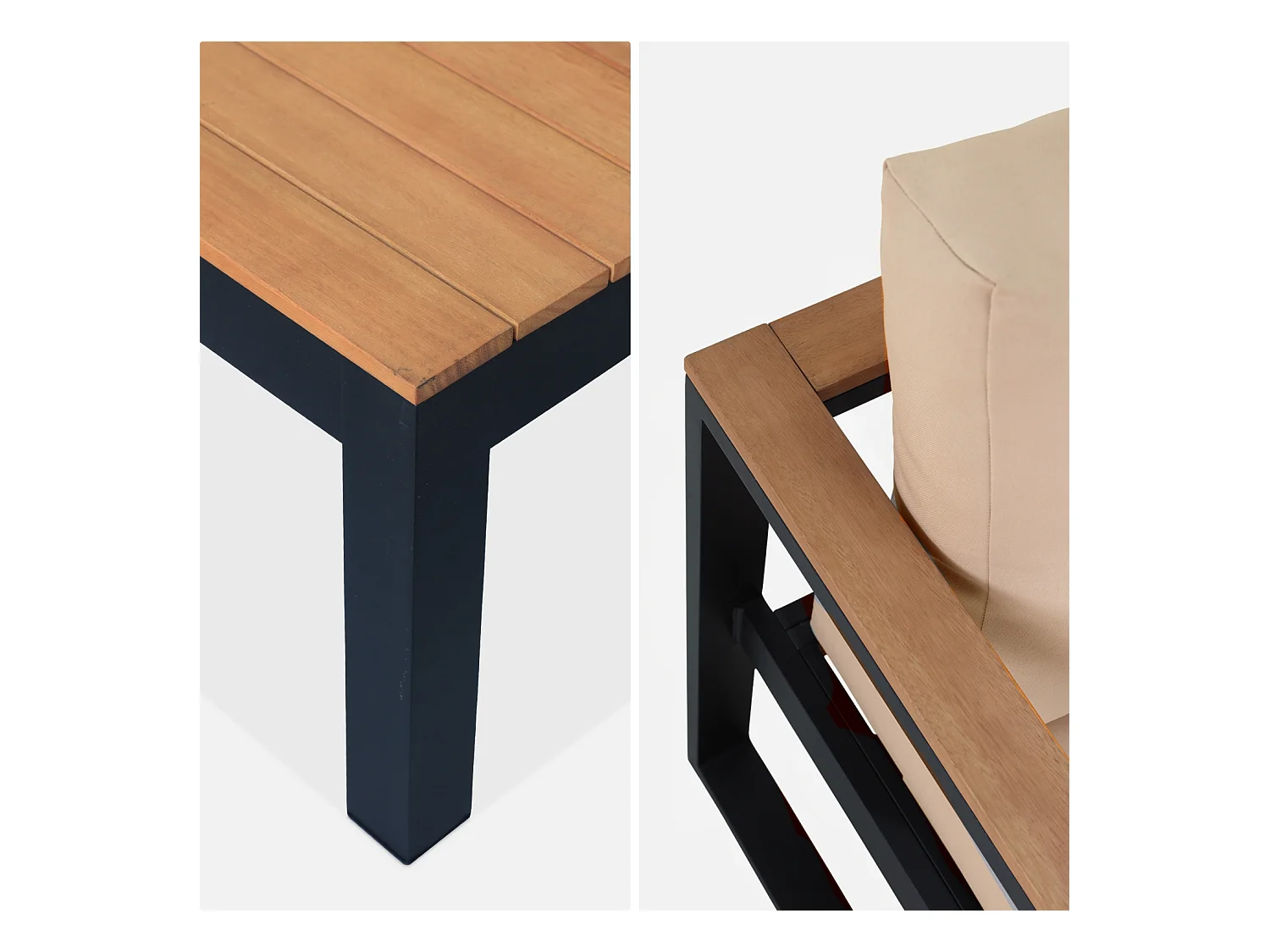 Salon de jardin 5 places en aluminium et eucalyptus – NAZCA – Structure noire. Coussins beige