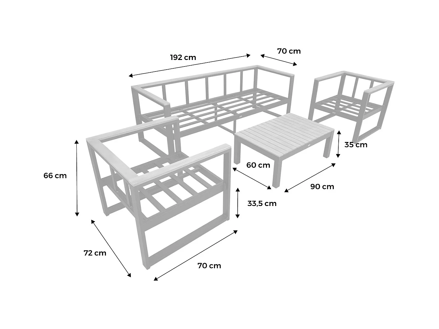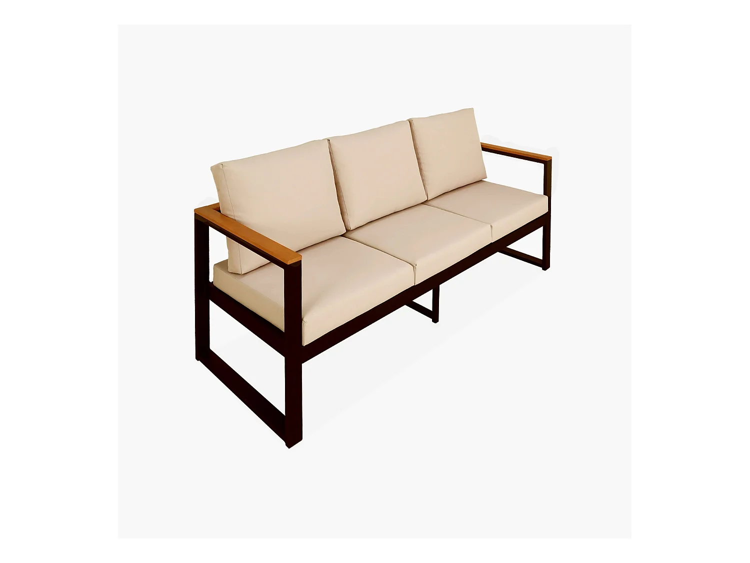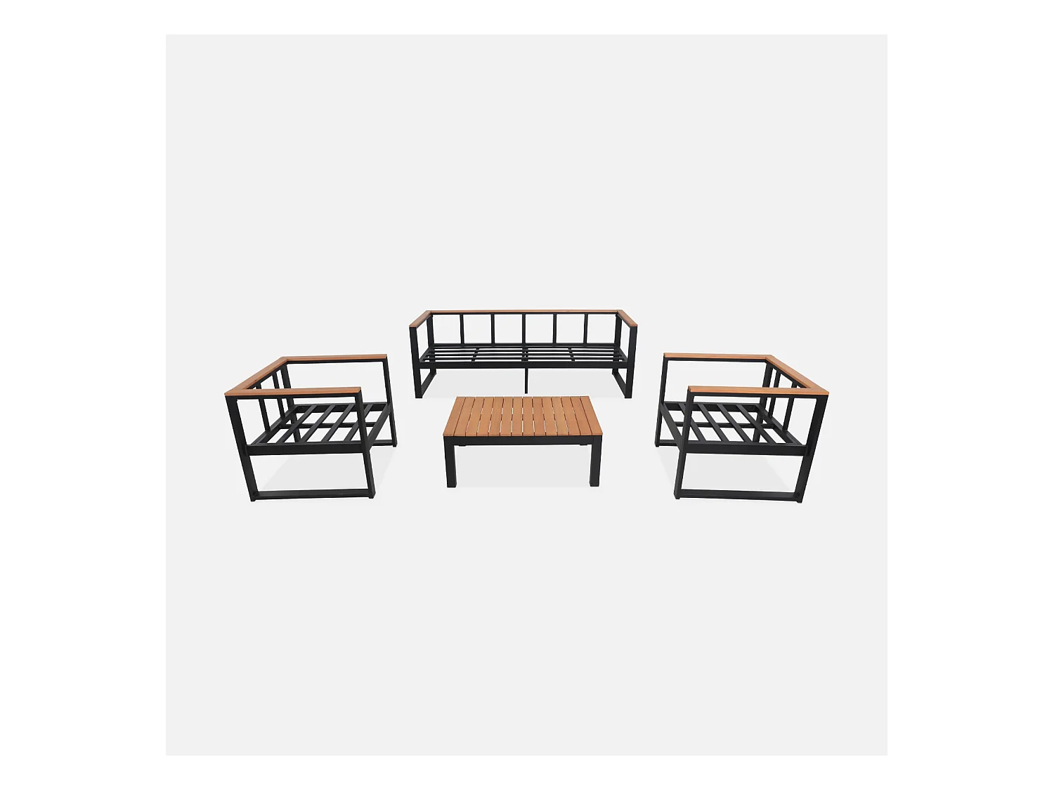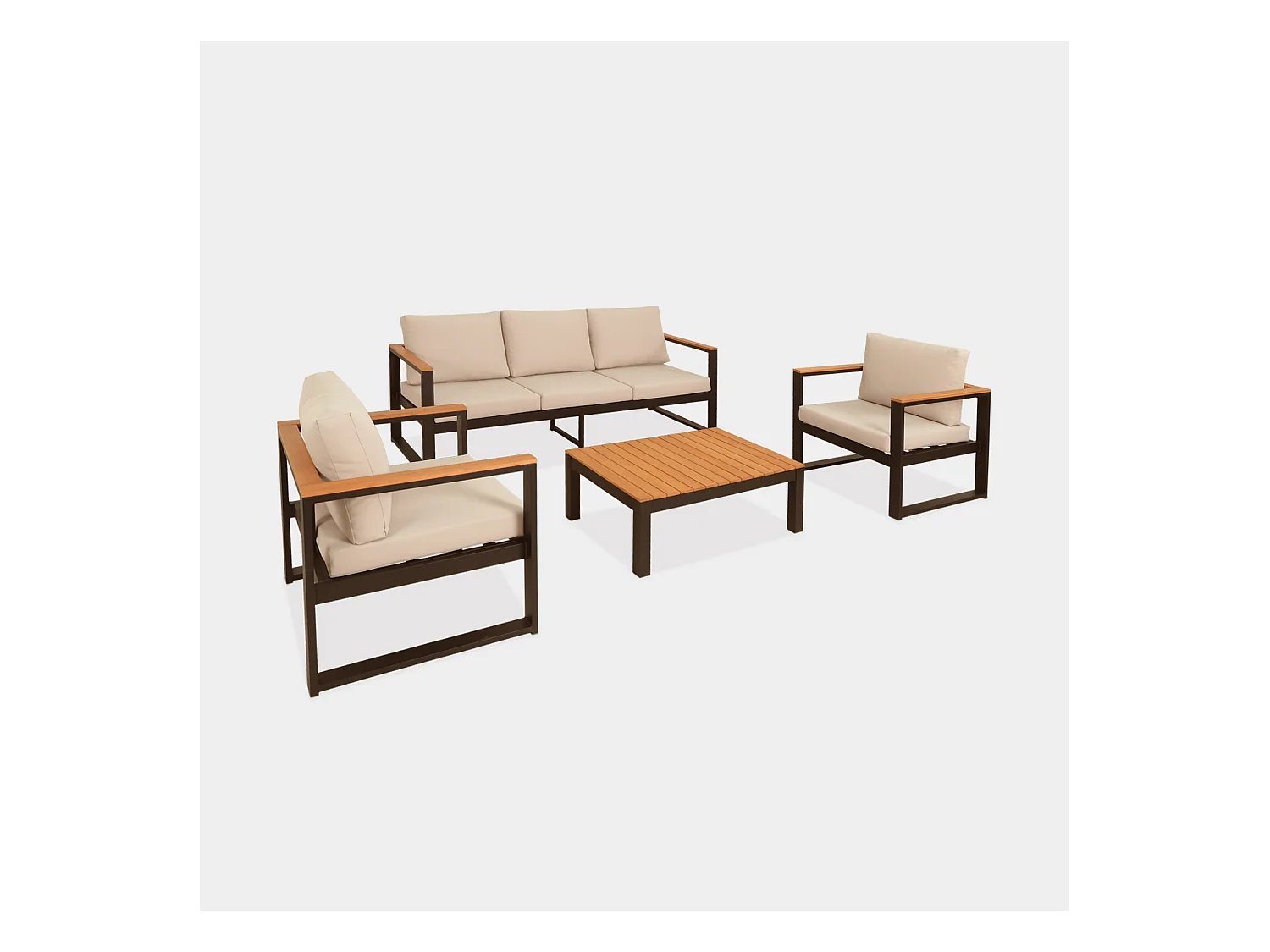 Salon de jardin 5 places en aluminium et eucalyptus – NAZCA – Structure noire. Coussins beige