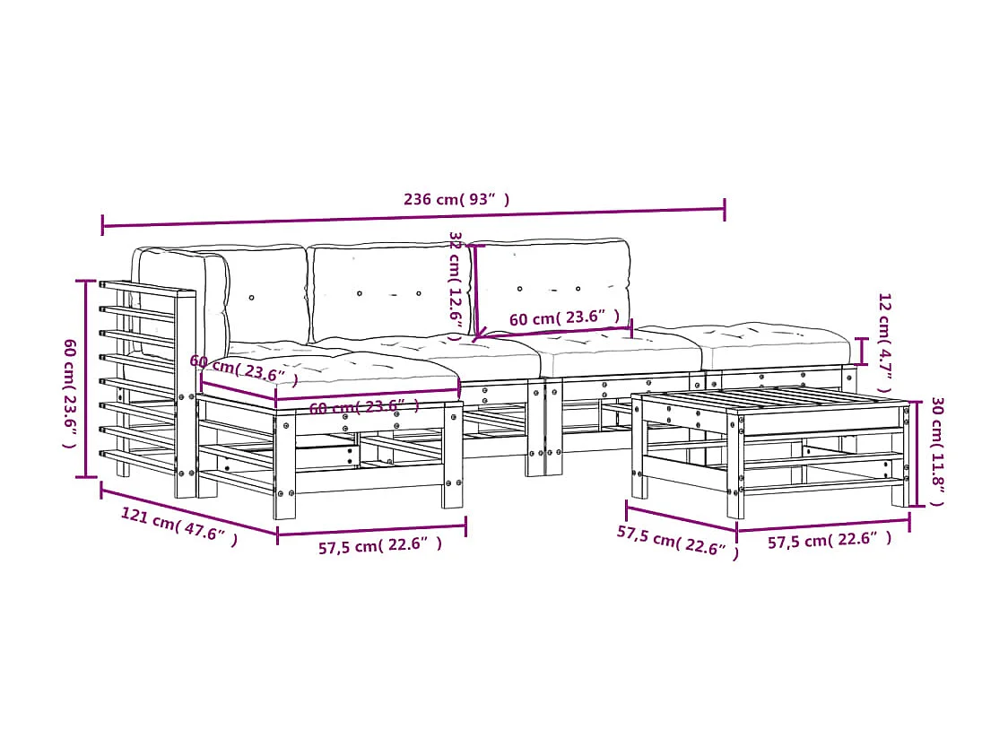 Salon de jardin 6 pcs avec coussins blanc bois massif