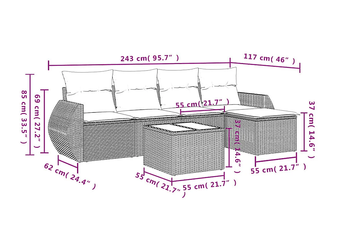 Salon de jardin 6 pcs avec coussins gris résine tressée