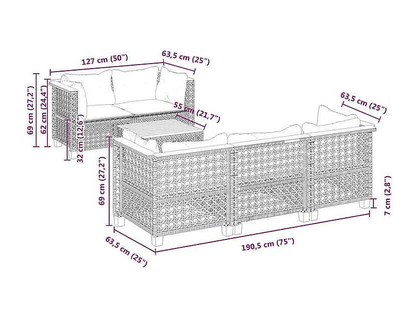 Salon de jardin 6 pcs avec coussins noir résine tressée