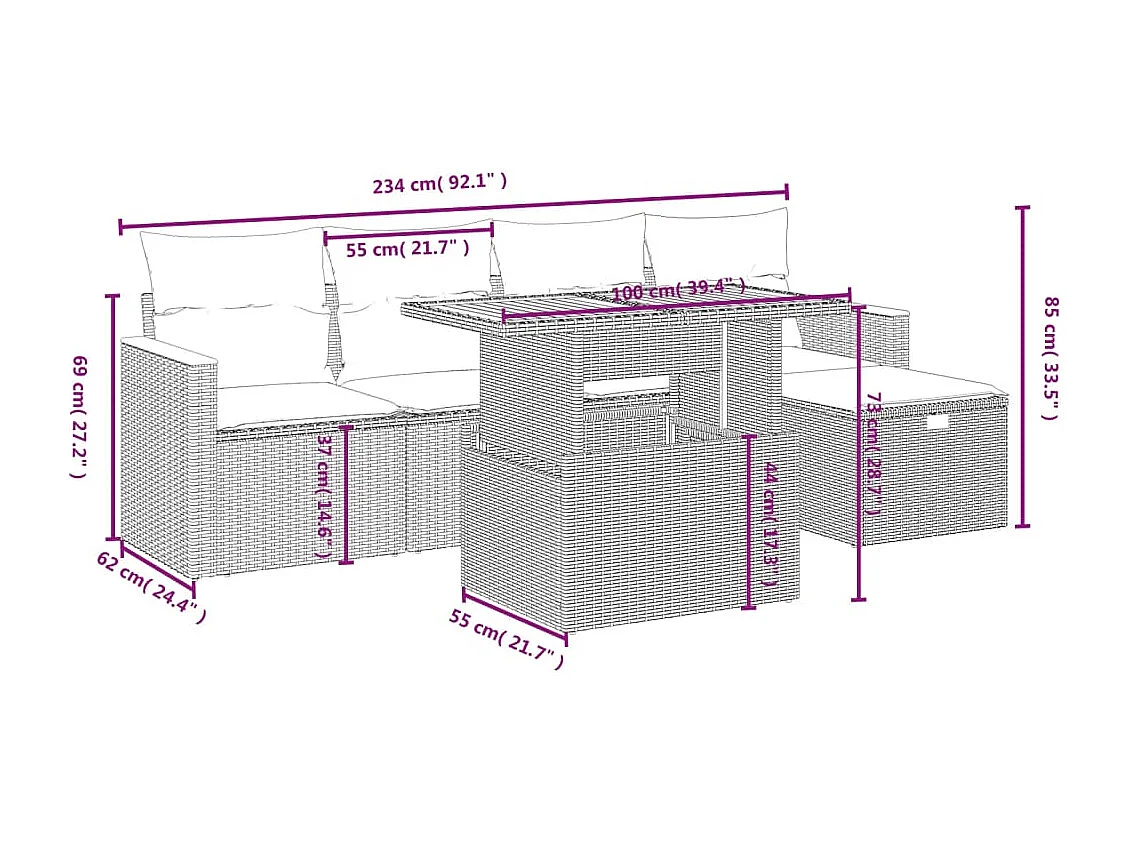 Salon de jardin 6 pcs avec coussins noir résine tressée