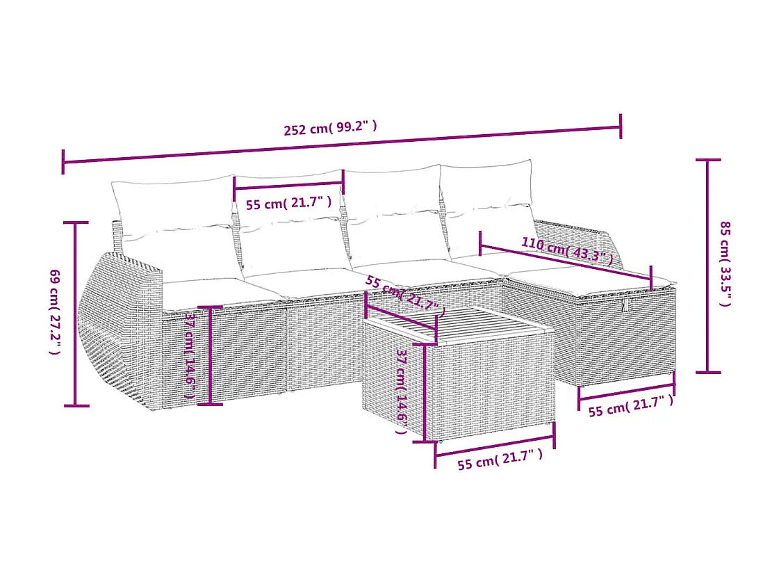 Salon de jardin 6 pcs avec coussins noir résine tressée