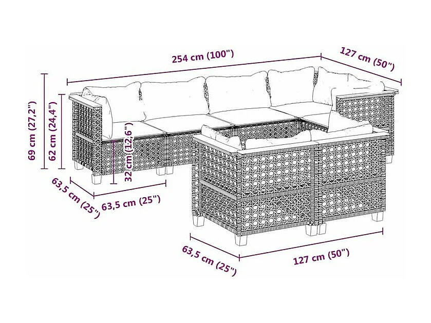 Salon de jardin 7 pcs avec coussins noir résine tressée