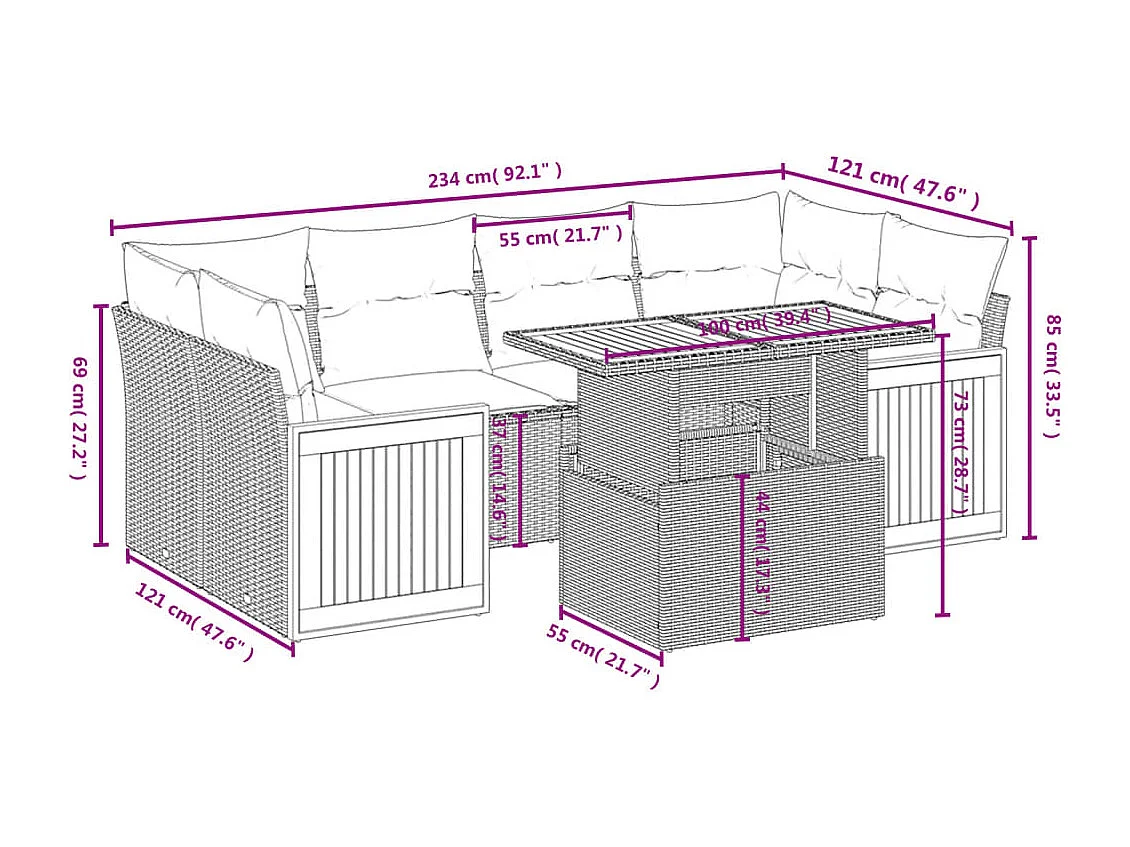 Salon de jardin 7 pcs avec coussins noir résine tressée