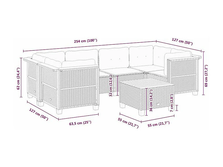 Salon de jardin 7 pcs avec coussins noir résine tressée