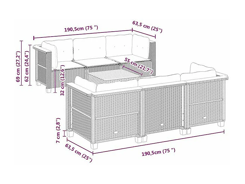 Salon de jardin 7 pcs avec coussins noir résine tressée