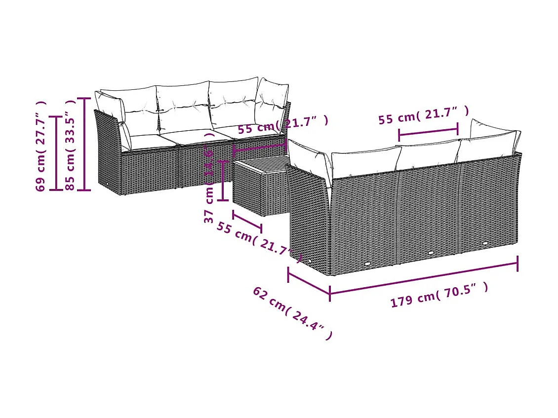 Salon de jardin 7 pcs avec coussins noir résine tressée