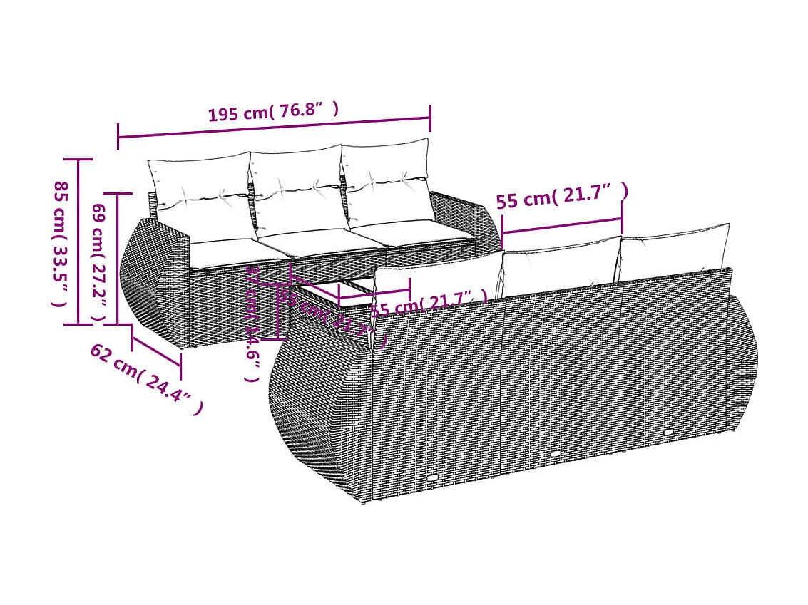 Salon de jardin 7 pcs avec coussins noir résine tressée