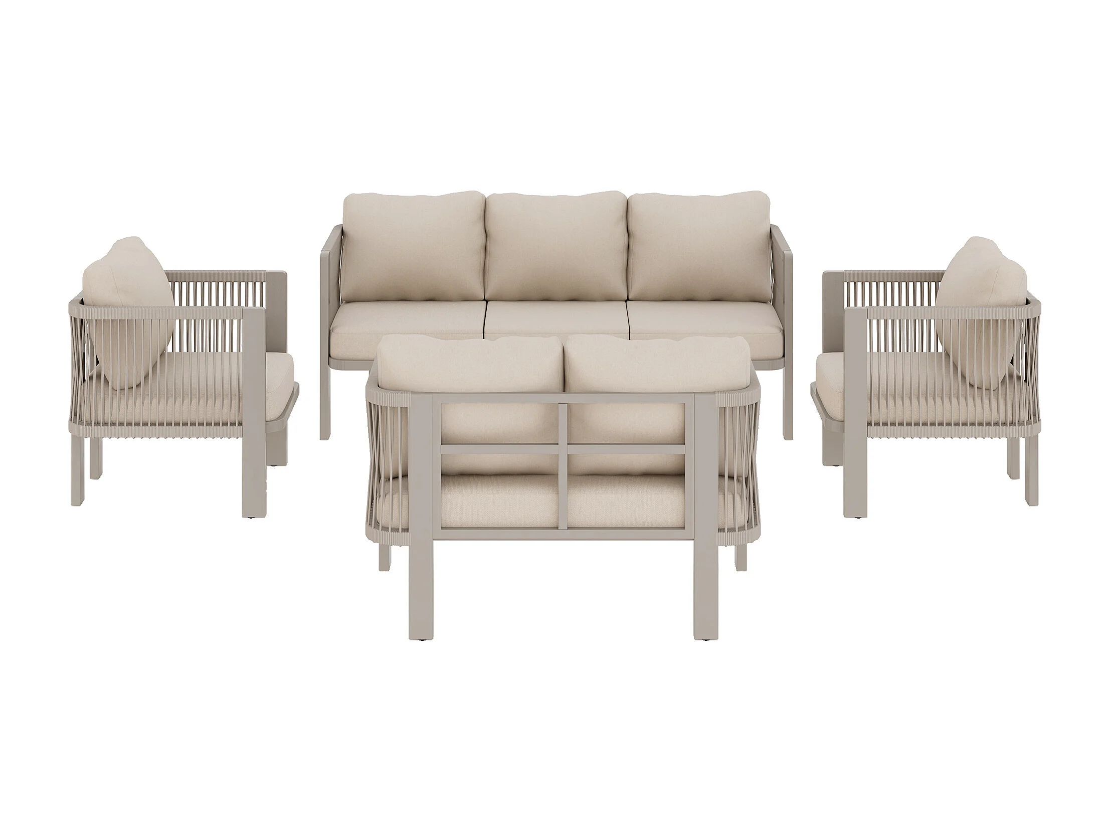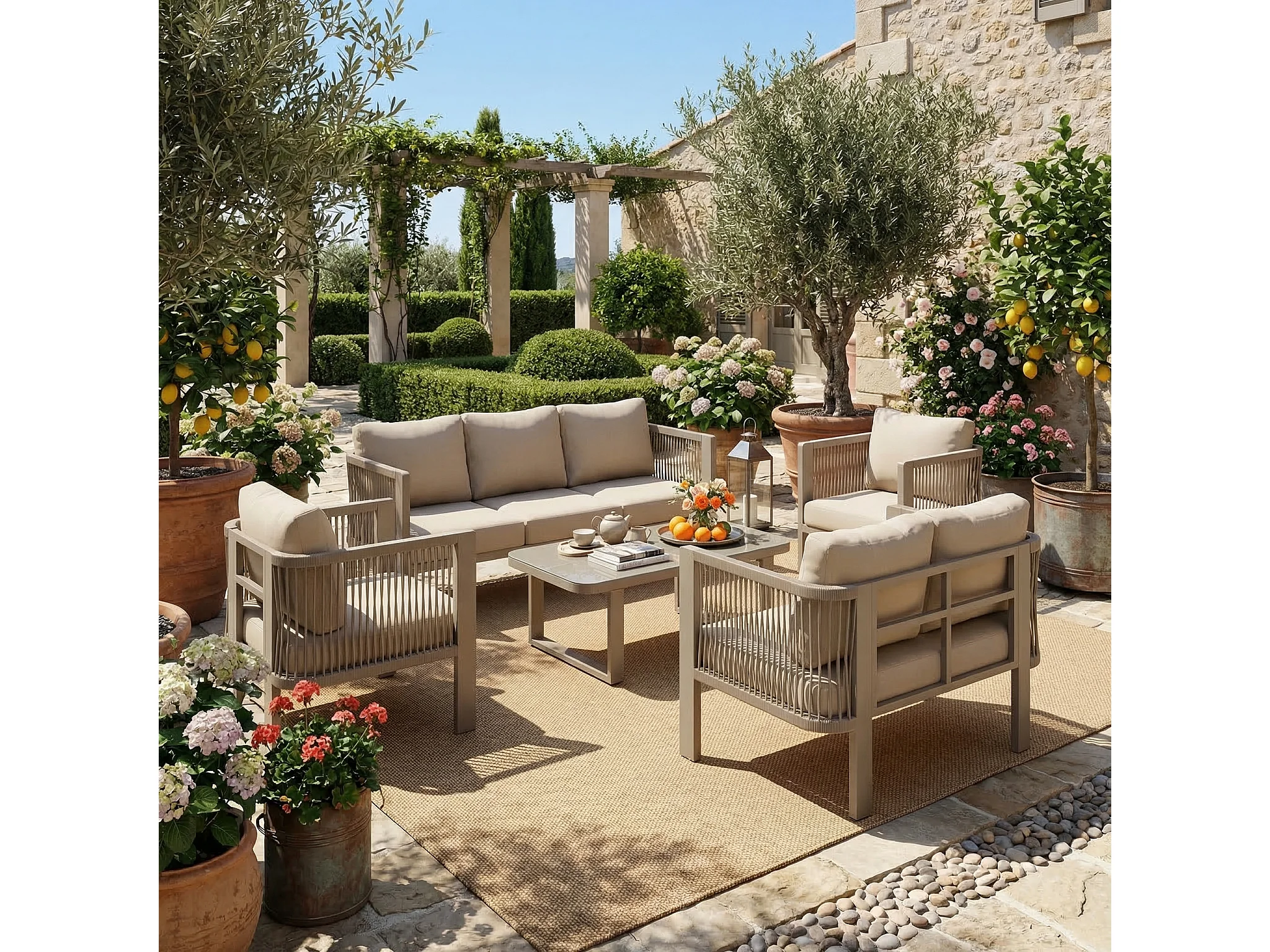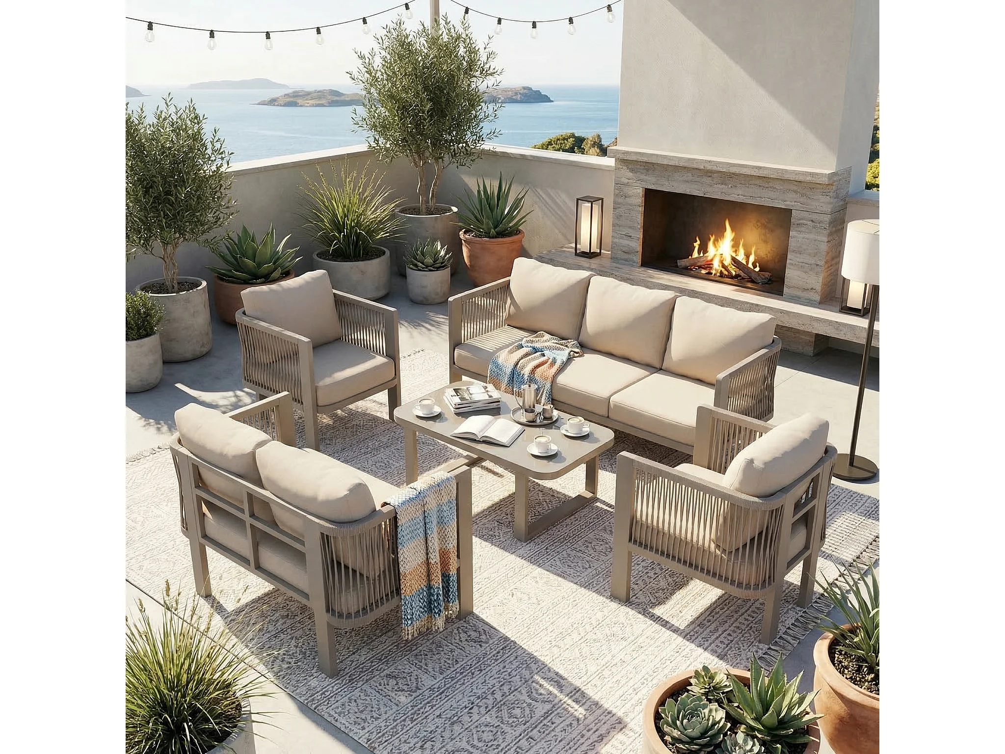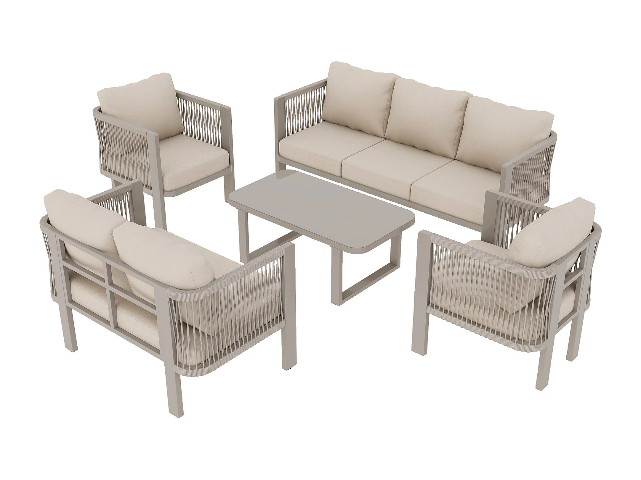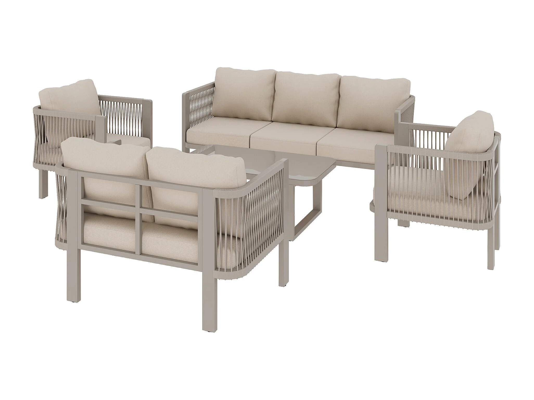 Salon de Jardin 7 Places avec Table Basse en Verre - Ensemble Canapés et Fauteuils en Corde Teslin Tressée - Acier Galvanisé - Khaki