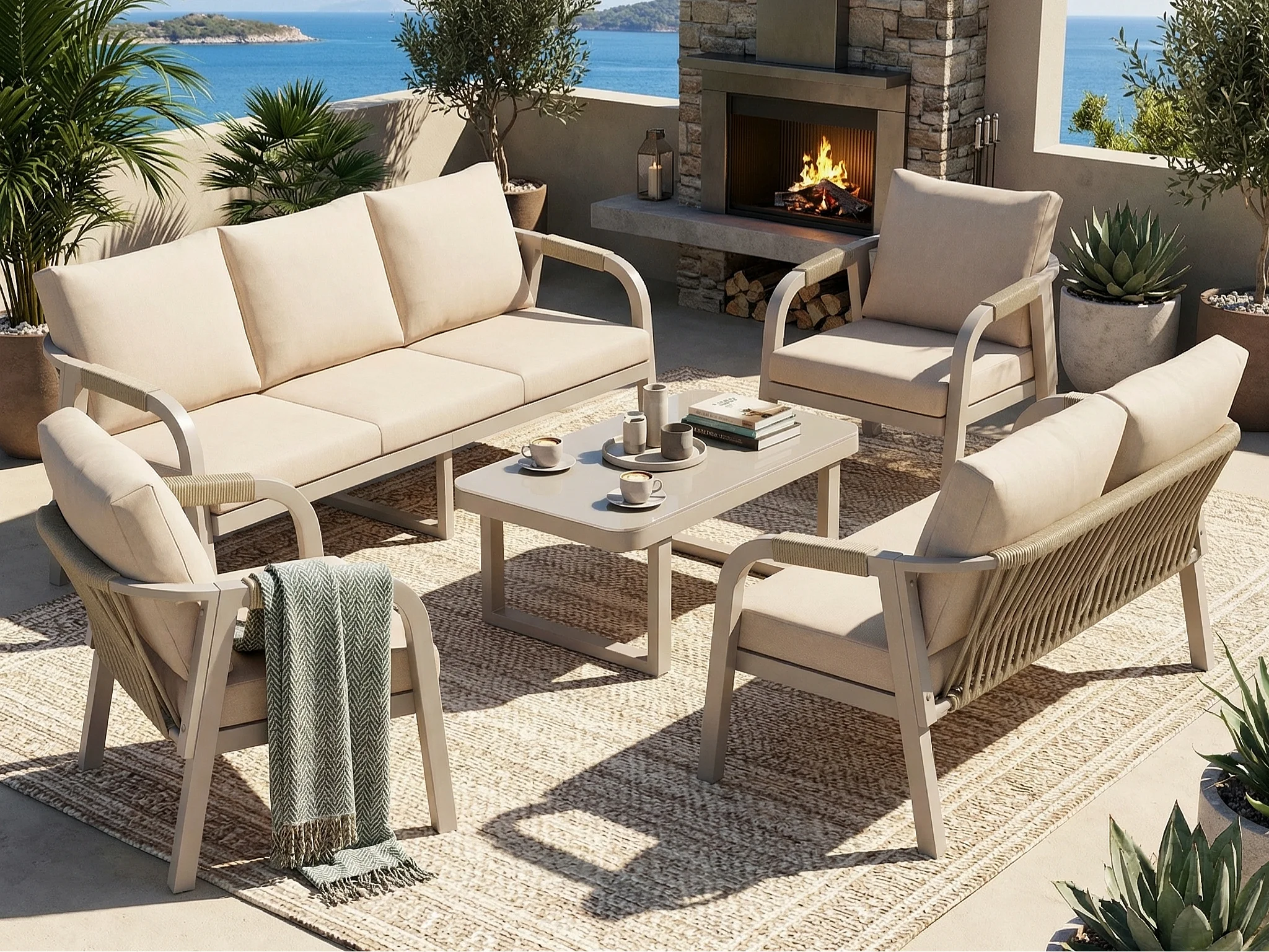 Salon de Jardin 7 Places - Ensemble de 5 Pièces avec Canapé 3 places, 2 places, 2 Fauteuils et Table Basse - Corde Tressée - Acier Galvanisé - Beige