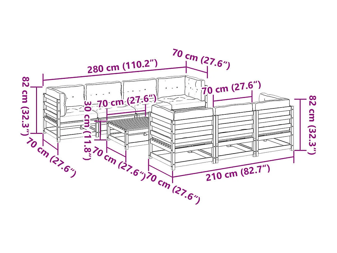 Salon de jardin 8 pcs avec coussins bois de pin massif
