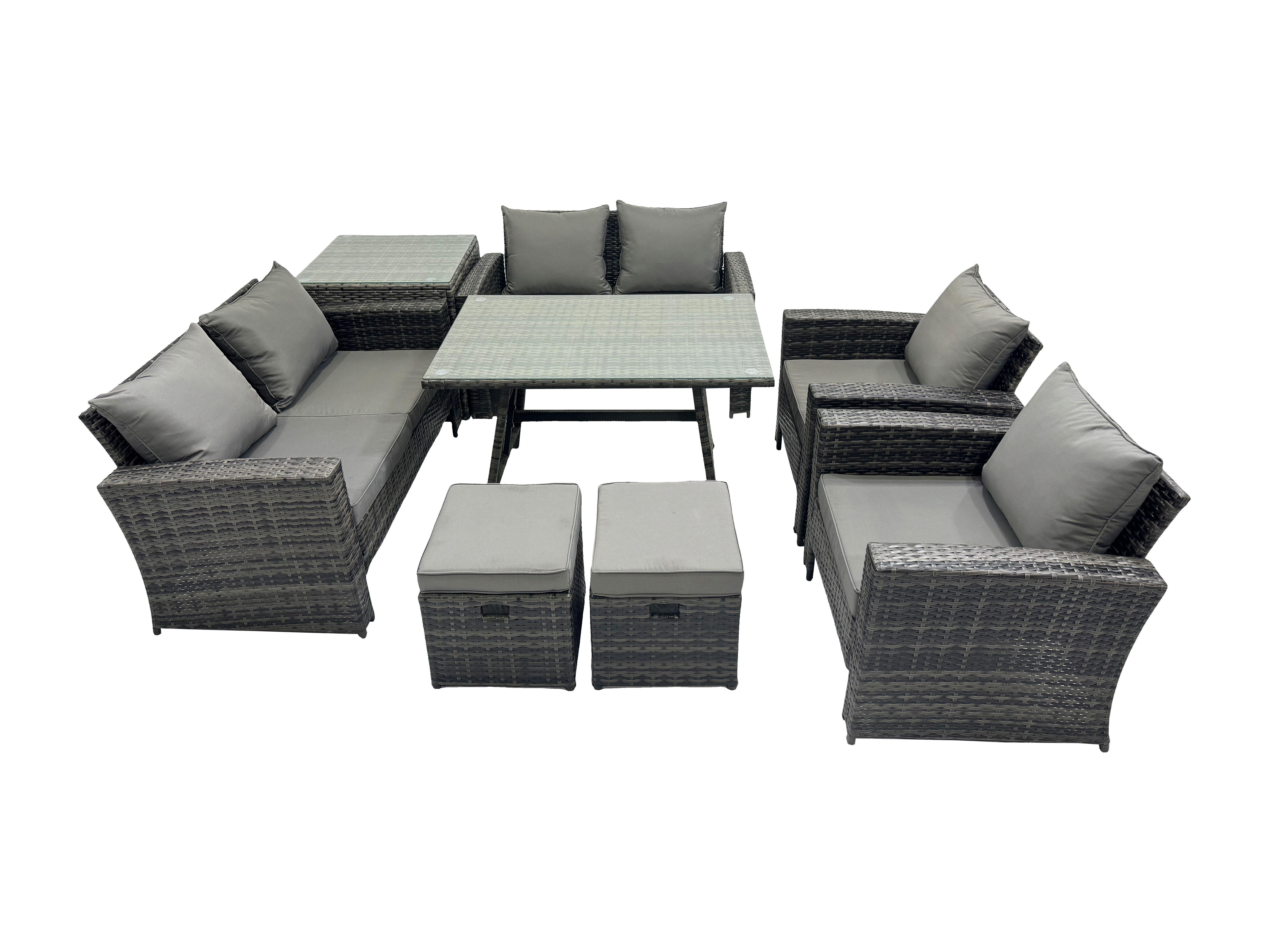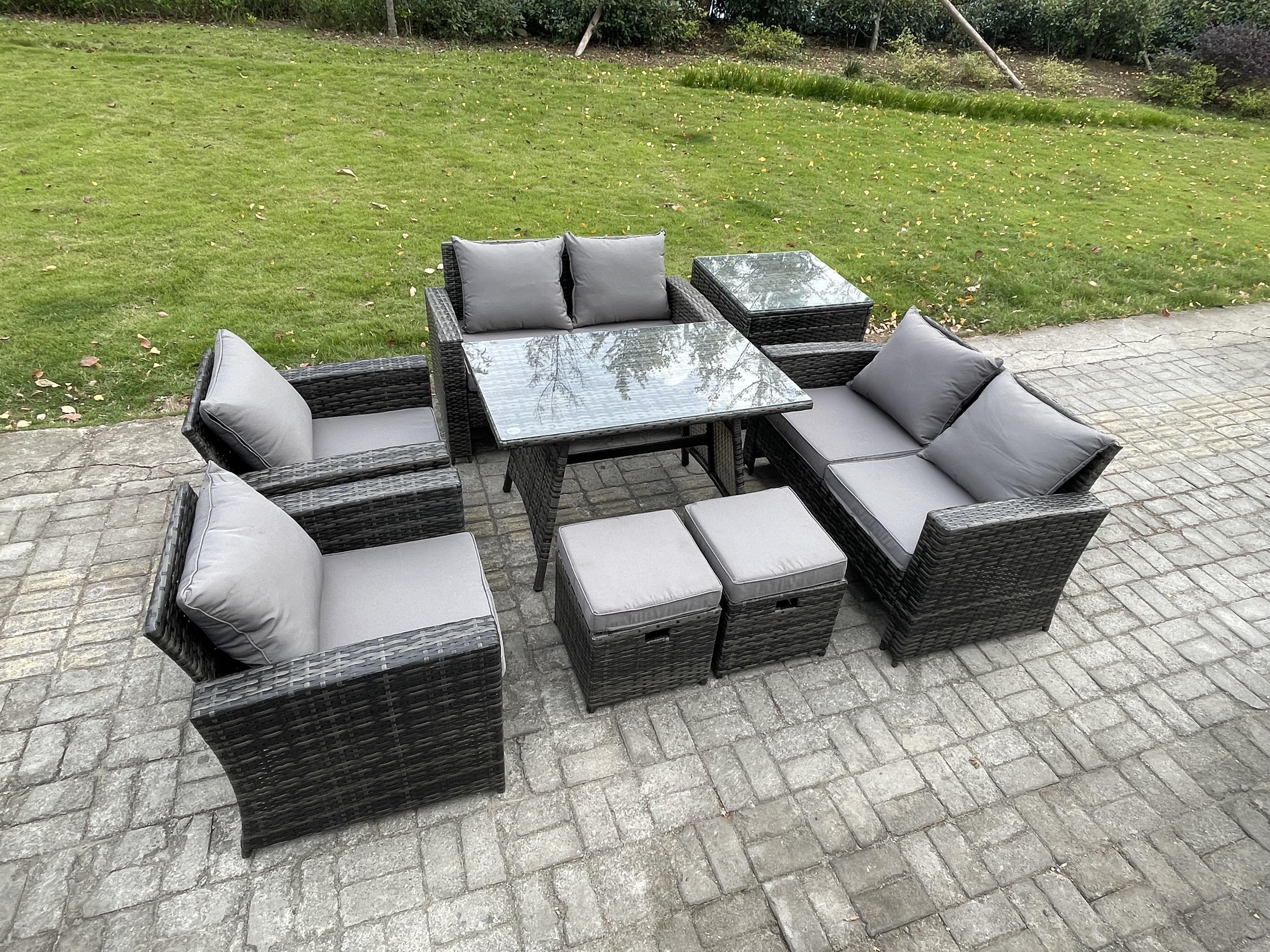 Salon de jardin 8 places avec Table à manger rectangulaire Canapé à deux places Table d'appoint 2 Petits tabourets Gris foncé mixte