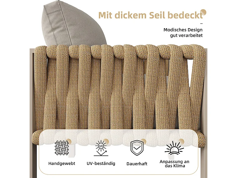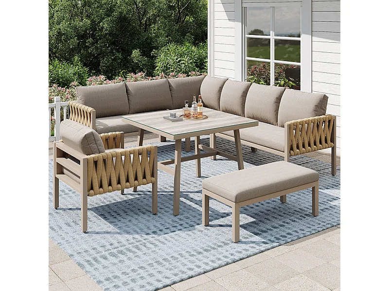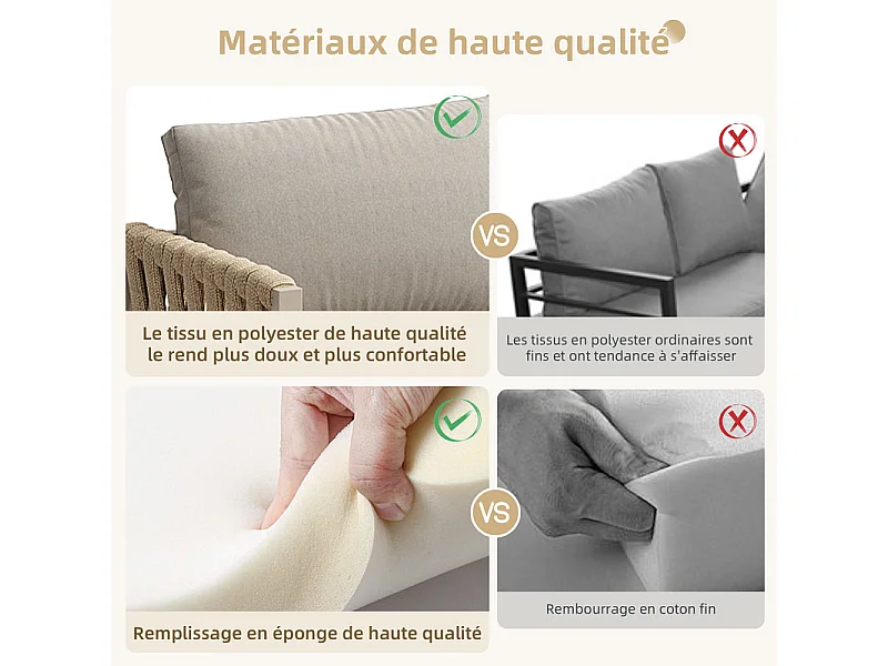 Salon de jardin 8 places en métal: canapé d'angle modulable, 1 fauteuil, 1 tabouret et table basse - Beige
