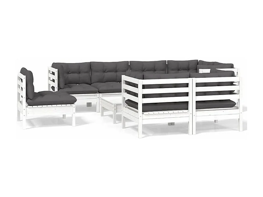 Salon de jardin 9 pcs avec coussins blanc bois de pin massif