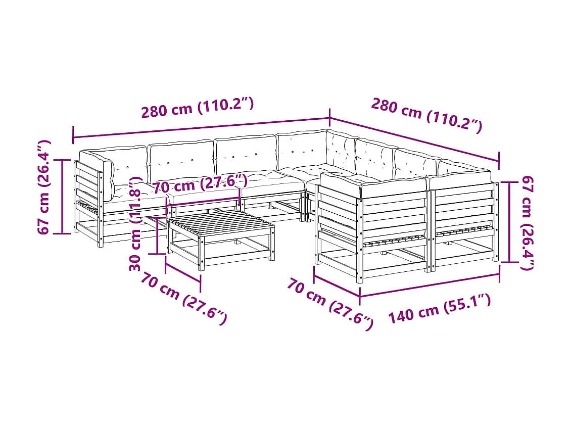 Salon de jardin 9 pcs avec coussins bois de pin imprégné