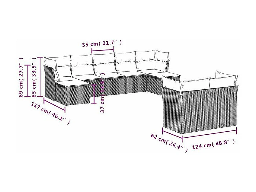 Salon de jardin 9 pcs avec coussins gris clair résine tressée