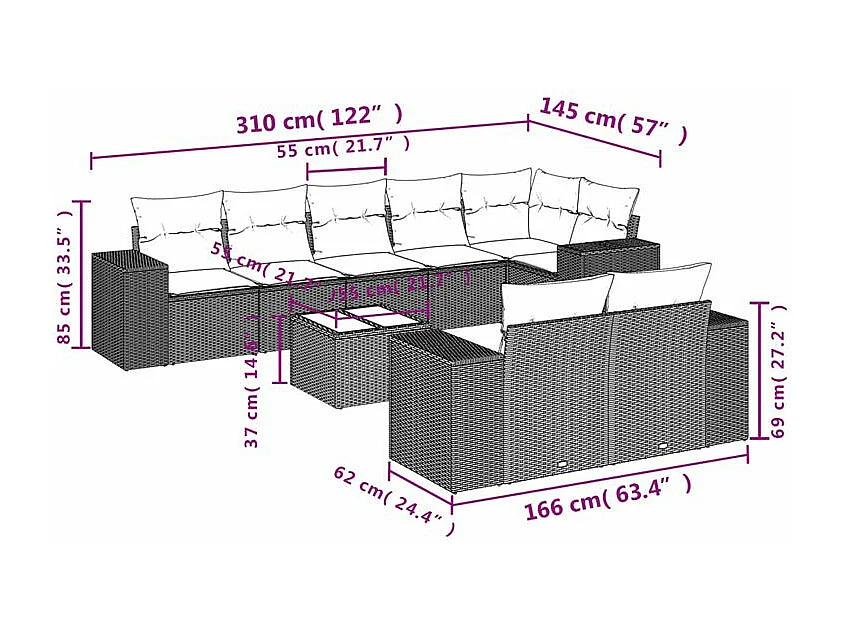 Salon de jardin 9 pcs avec coussins gris clair résine tressée