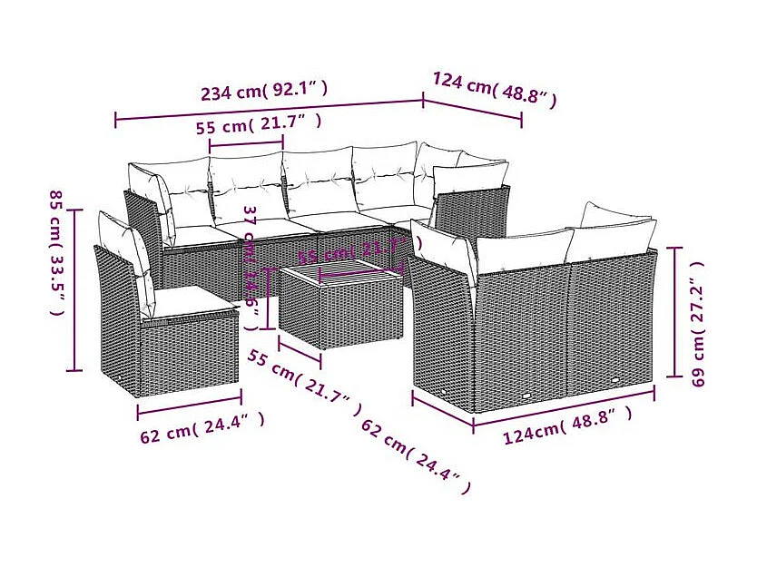 Salon de jardin 9 pcs avec coussins gris résine tressée