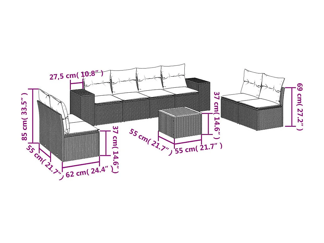 Salon de jardin 9 pcs avec coussins gris résine tressée