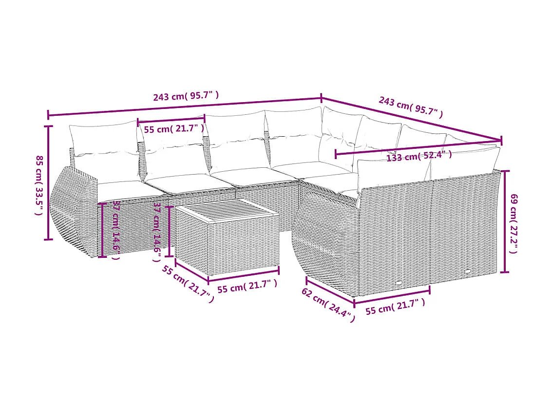 Salon de jardin 9 pcs avec coussins gris résine tressée