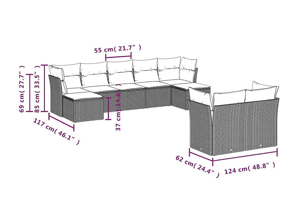 Salon de jardin 9 pcs avec coussins gris résine tressée