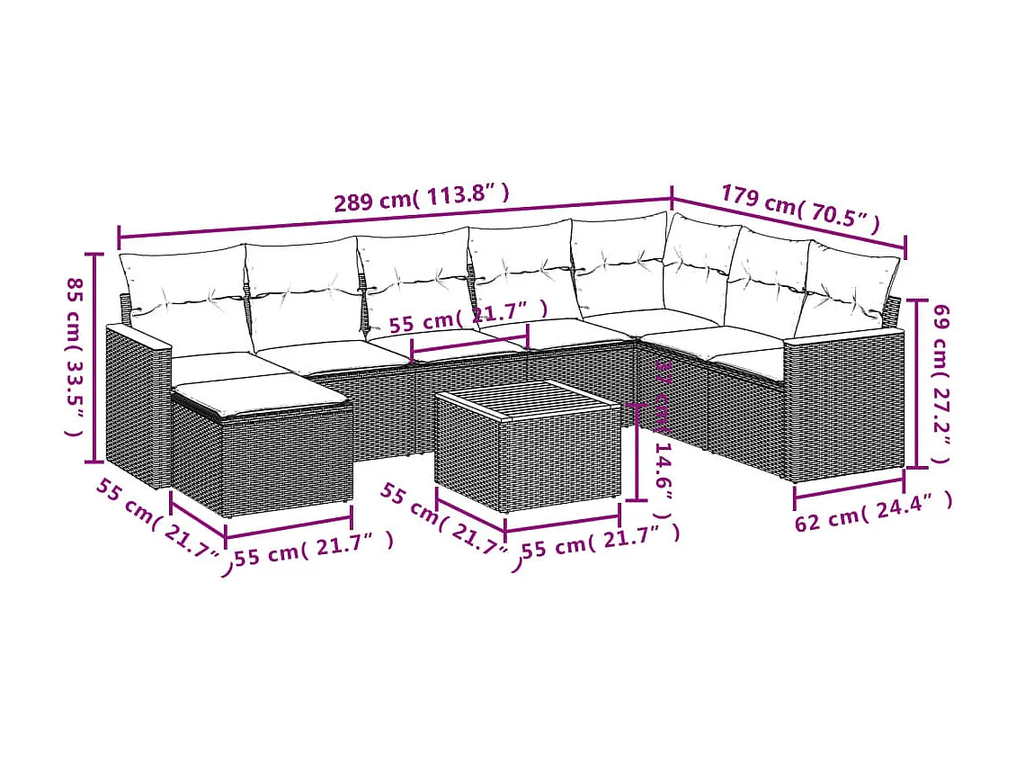 Salon de jardin 9 pcs avec coussins gris résine tressée