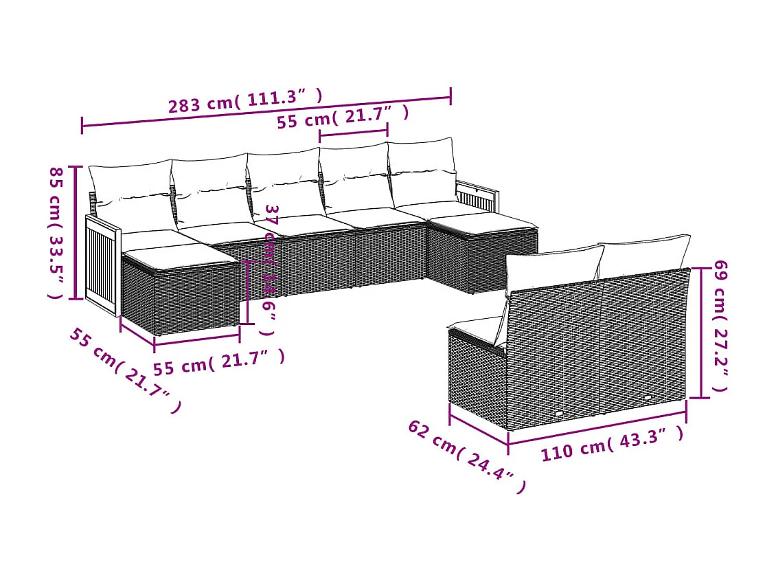 Salon de jardin 9 pcs avec coussins gris résine tressée
