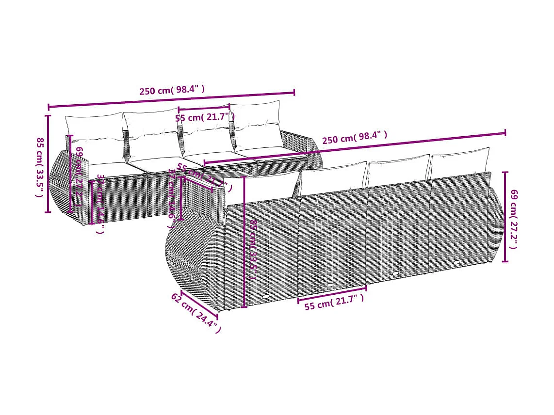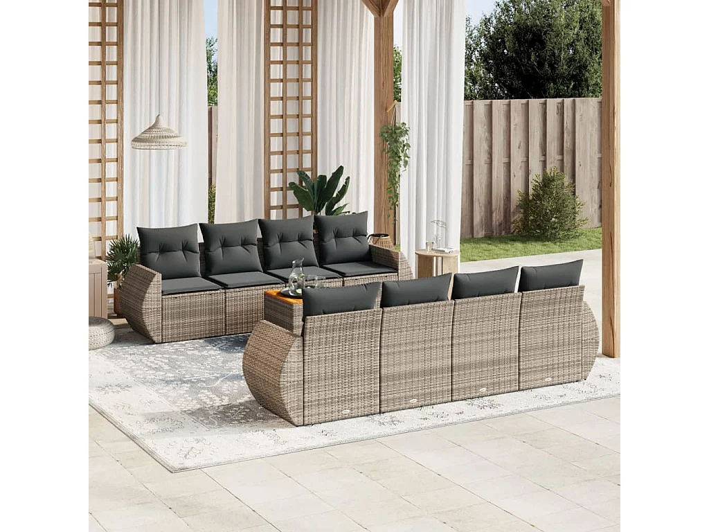 Salon de jardin 9 pcs avec coussins gris résine tressée