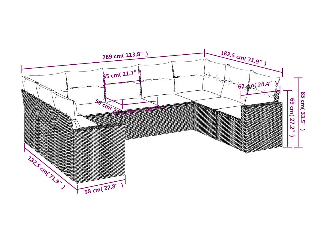 Salon de jardin 9 pcs avec coussins gris résine tressée