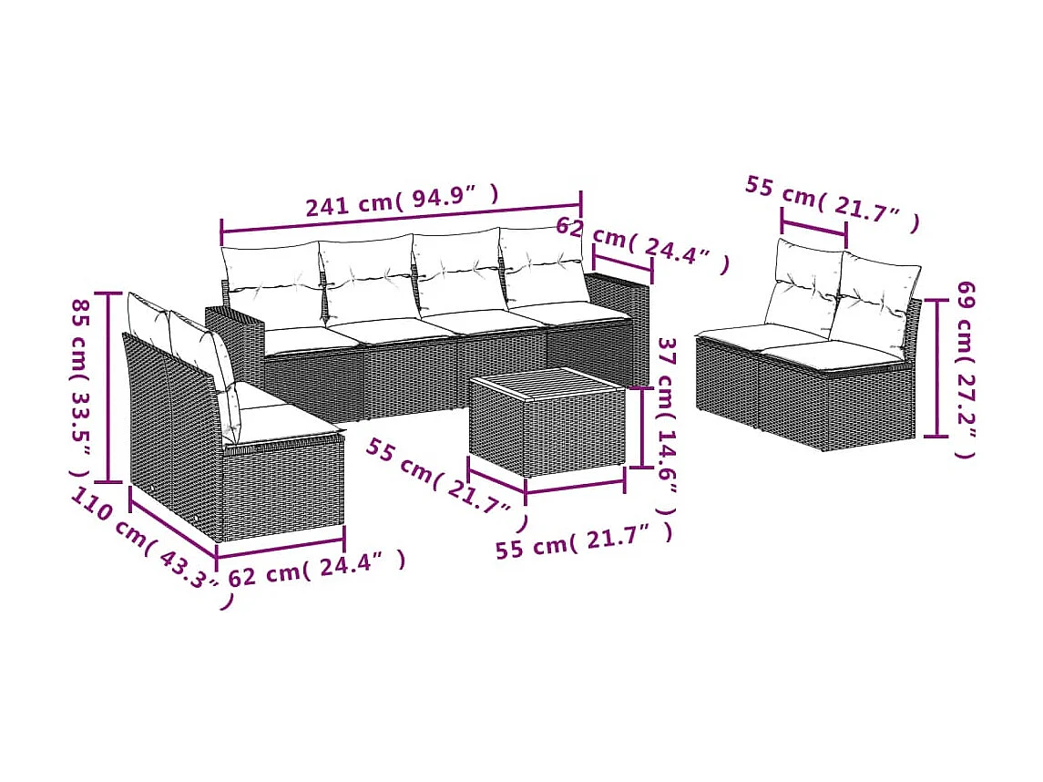 Salon de jardin 9 pcs avec coussins gris résine tressée