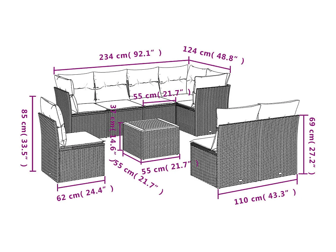 Salon de jardin 9 pcs avec coussins gris résine tressée