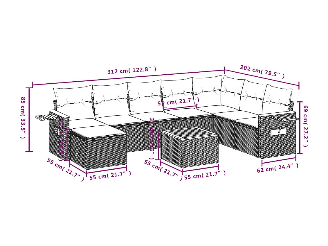 Salon de jardin 9 pcs avec coussins gris résine tressée